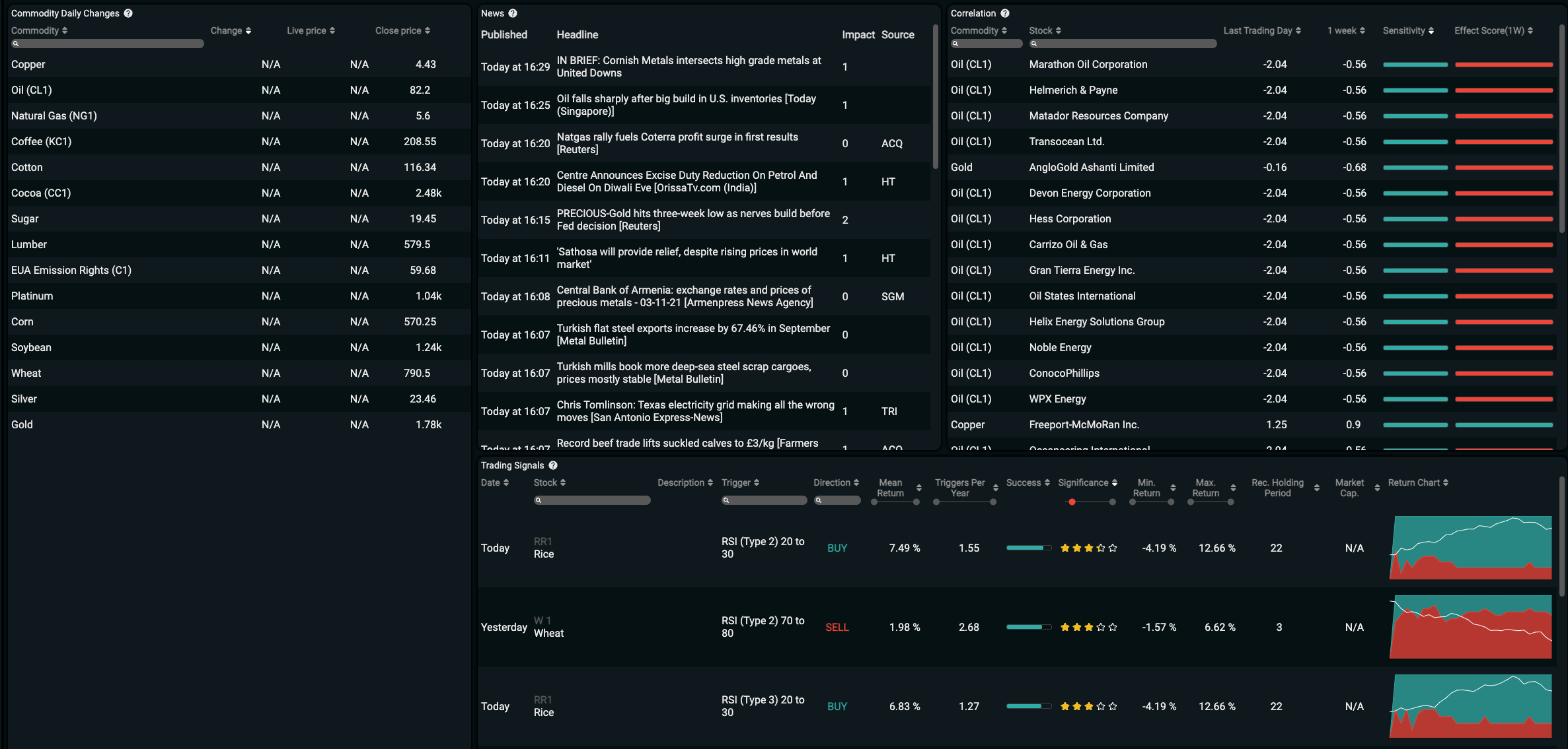 For each signal we tell you how many times the signal has triggered in the past, the success rate and the average return, as well as what holding period has previously given the best return. We also help you visualize this with star ratings, success bars and charts.
